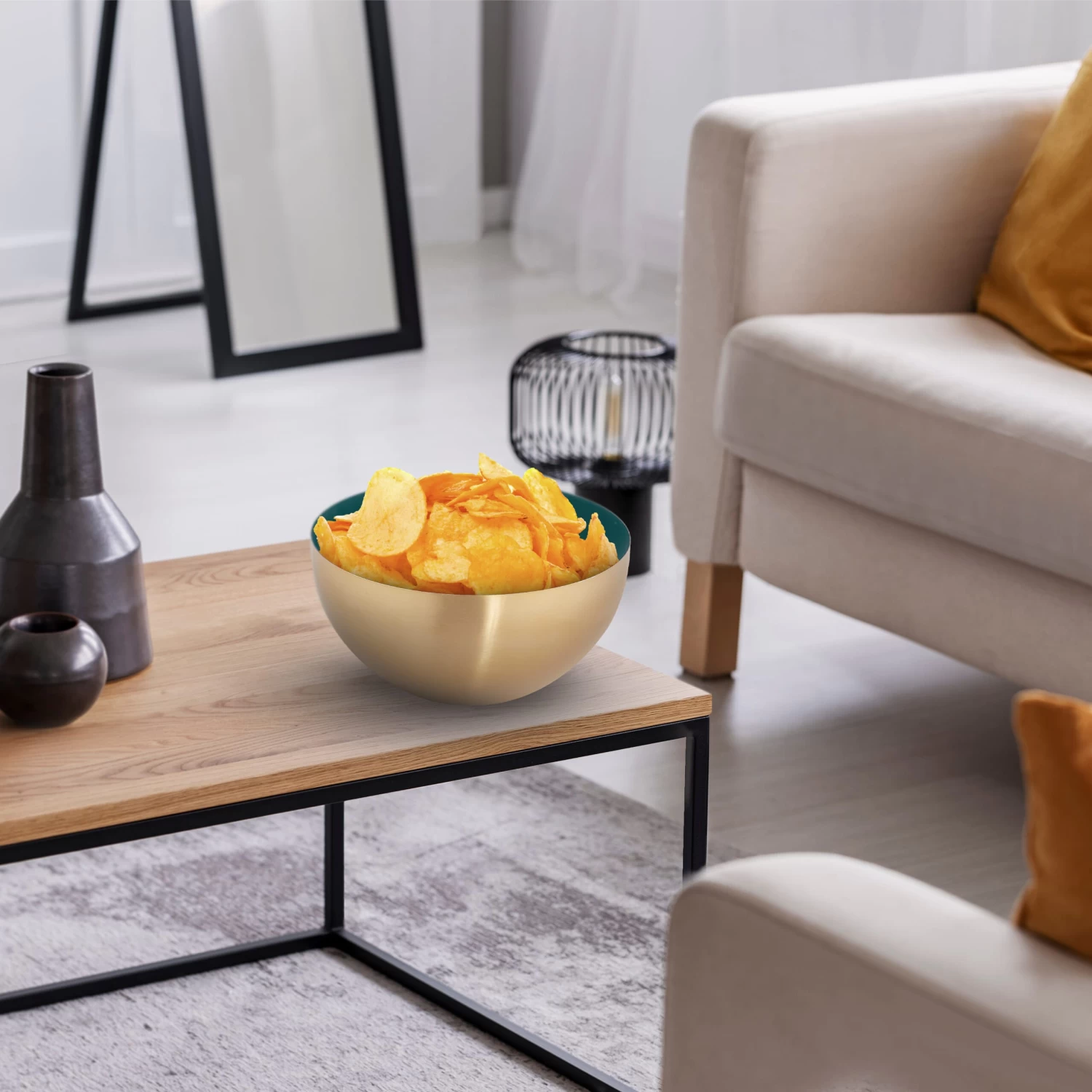 Mit dieser edlen Metallschüssel servierst Du Salate, Chips und andere Snacks besonders dekorativ. Das elegante, zweifarbige Design der Salatschüssel ist dabei ein Blickfang auf jeder gedeckten Tafel. Aber nicht nur als Servierschale, sondern auch als Rührschüssel zum Zubereiten von Teig beim Backen ist die Kochschüssel wunderbar geeignet. Die Schüssel besteht aus langlebigem Edelstahl und kann nach dem Gebrauch unter fließendem Wasser schnell und einfach gereinigt werden.