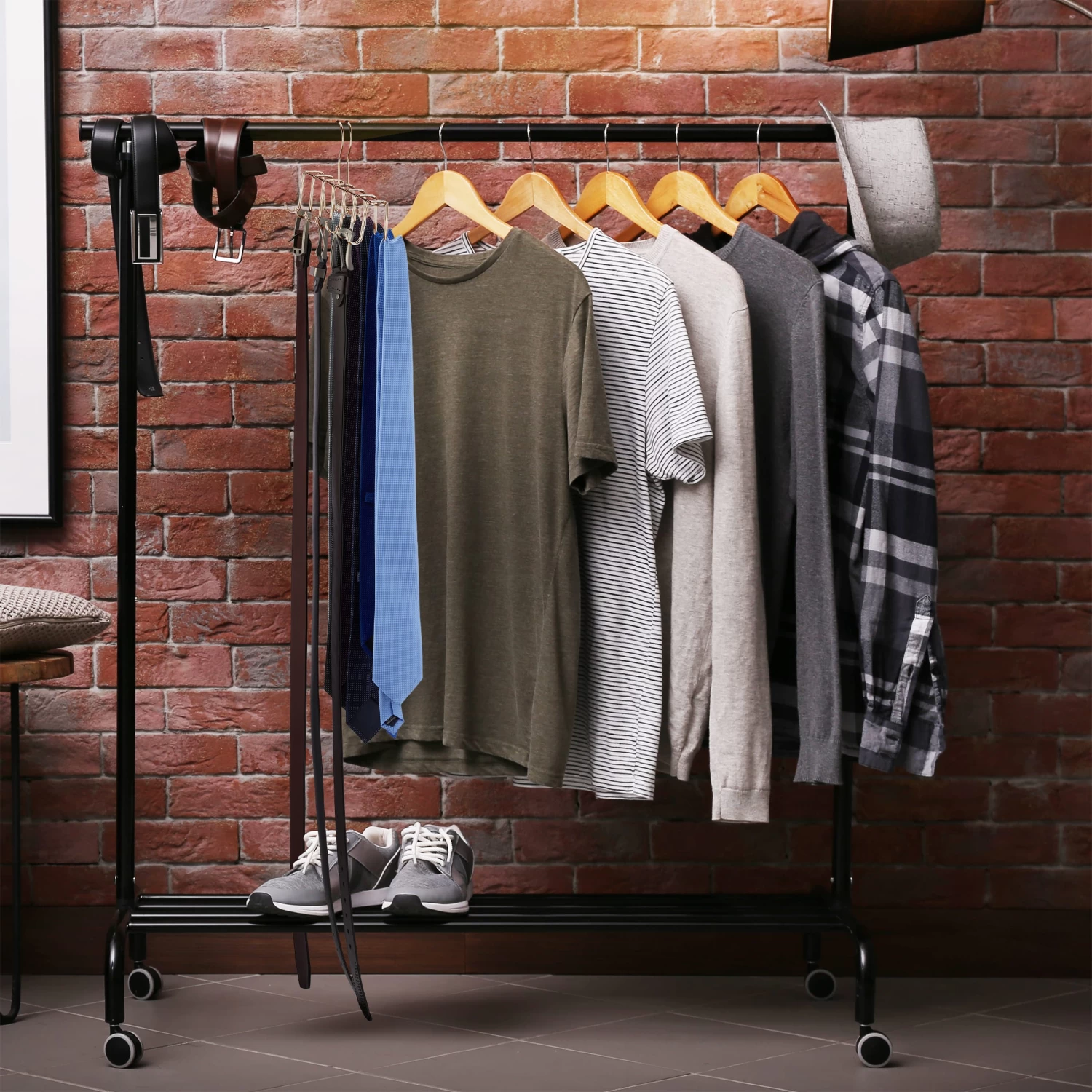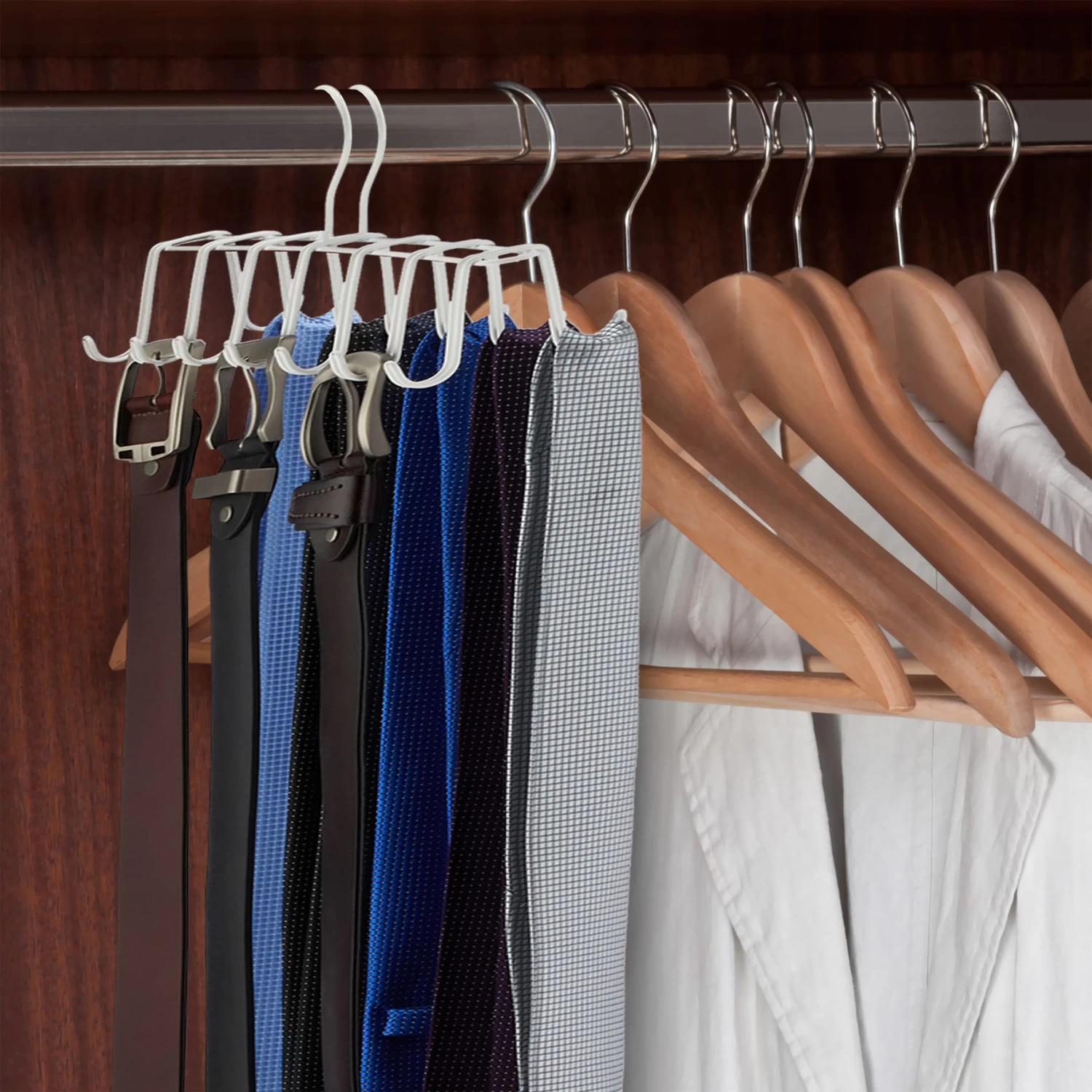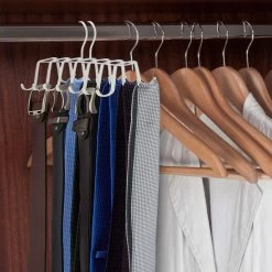 Wenn Sie mit dem Gedanken spielen, Ihre Gürtel, Krawatten, Tücher oder andere Accessoires übersichtlich und ordentlich aufzuhängen, sollten Sie einen Teilabschnitt Ihrer Kleiderstange für diesen Gürtelhalter reservieren. Die 14 nach rechts bzw. nach links weisenden Haken sind fest mit dem Bügel aus robustem Eisendraht verbunden und machen es möglich, Gürtel freihängend aufzubewahren. Davon profitieren insbesondere Gürtel aus empfindlichen Materialien, deren Optik durch Knicken und Zusammenrollen schnell in Mitleidenschaft gezogen wird.