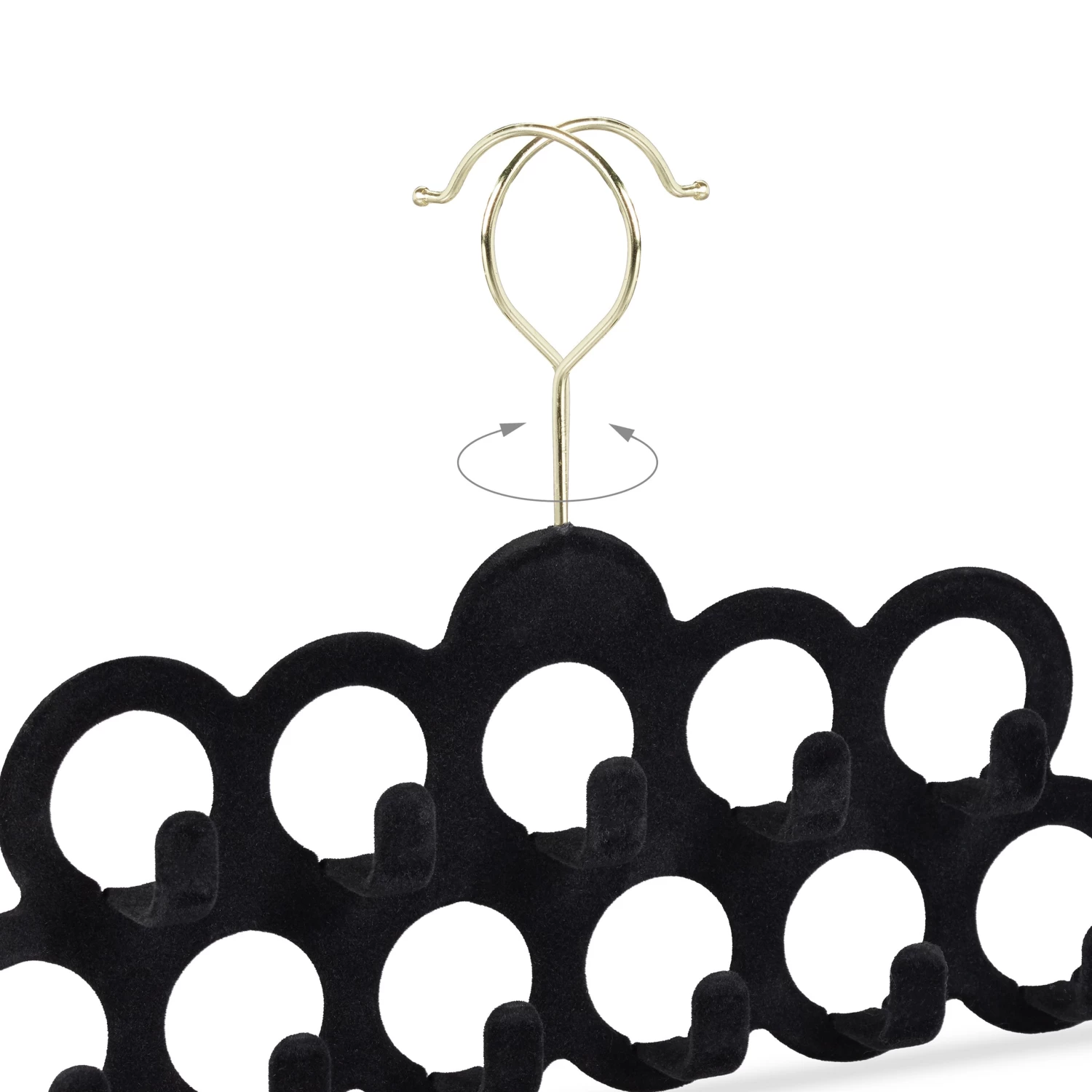 Mit dem Schalbügel bringen Sie Ordnung ins heimische Tücher-Chaos. Der besondere Clou sind die 11 Ringe am Bügel, in denen sich Schals, Tücher und Krawatten knitterfrei und ordentlich aufbewahren lassen. An den Haken können Gürtel und Schmuck praktisch aufgehängt werden. Dank der Anti-Rutsch Oberfläche werden Ihre Accessoires vor lästigem Herunterrutschen bewahrt. Das samtige Design ist zudem ein echter Hingucker im Schrank oder an der Garderobe. Der Aufhänge-Haken ist um 360° drehbar.
