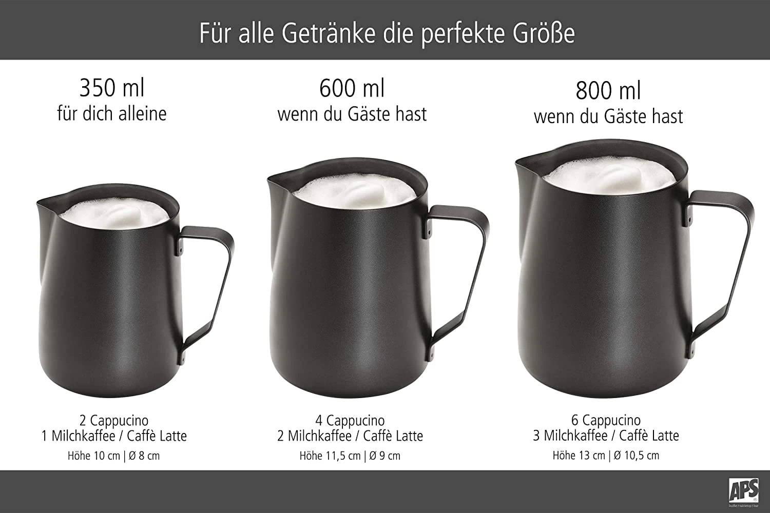 Die Kanne besteht aus Edelstahl mit einer speziellen Antihaftbeschichtung (innen & außen). Sie verfügt zudem über einen tropffreien Ausguss, der es ermöglicht bestens einen Cappuccino mit kunstvoller Latte-Art zu verzieren. Die Milch sollte beim Aufschäumen idealerweise ca. 65 °C erreichen, um noch nicht anzubrennen. Das Milchkännchen sollte zuvor nicht erhitzt werden. Der Artikel fasst ein Volumen von 350 ml, dies entspricht in etwa 2 Cappuccino & 1 Milchkaffee / Café Latte. Zudem ist die Kanne spülmaschinengeeignet, was eine leichte und bequeme Reinigung ermöglicht.