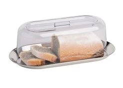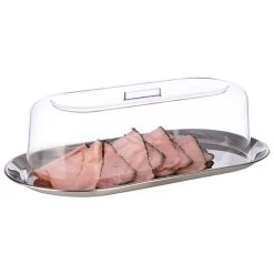 30 x 15,5 cm, H: 10,5 cm Set besteht aus: – Tablett aus Edelstahl30 x 15,5 cm, H: 1,5 cm hochglanzpoliert – Haube aus SAN25 x 12 cm, H: 10 cm
