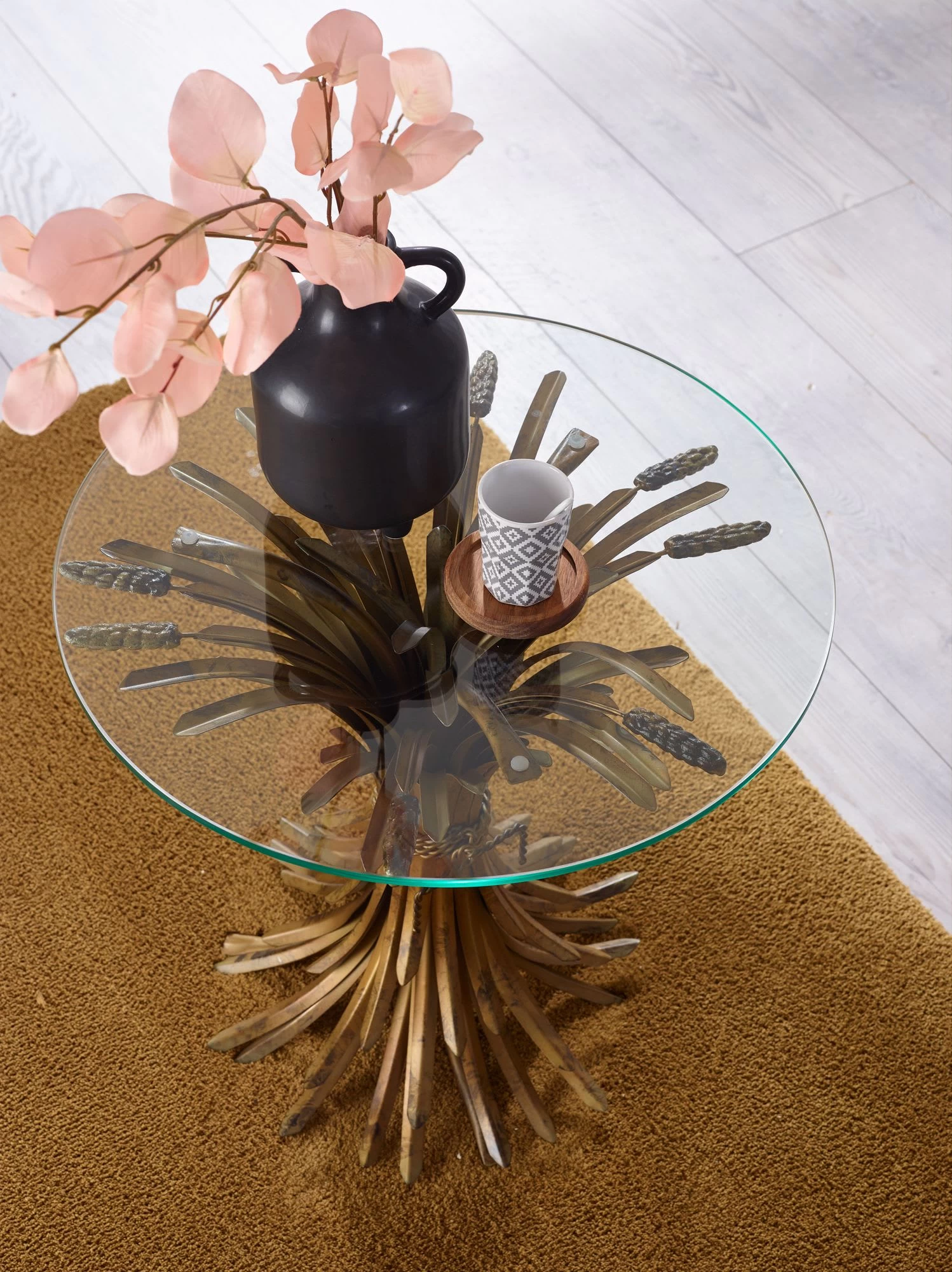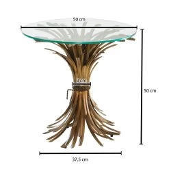 Design Ausgefallener Beistelltisch in modernem Design Runde & durchsichtige Tischplatte Goldfarbenes Metallgestell in Form eines Pflanzenbündels Abmessungen Breite: 50 cm Tiefe: 50 cm Höhe: 50 cm Durchmesser Tischplatte: 50 cm Tischplattenstärke: 0,8 cm Weitere Abmessungen finden Sie im Maßbild Farbe Tischplatte: Transparent Gestell: Golden Besonderheiten Jeder Tisch wurde in liebevoller Handarbeit gefertigt und ist somit ein absolutes Unikat Viel Platz zur Ablage von Zeitschriften, Handy und Co. Aufgrund des Designs ein echter Hingucker und für viele Räume geeignet Anti-Rutsch-Noppen an den Beinen schützen Ihren Fußboden vor Kratzern Empfohlene Maximalbelastbarkeit: 10 kg Material Tischplatte: Einscheibensicherheitsglas Metallgestell: lackiertes Eisen Lieferumfang Ein Beistelltisch ohne Dekoration Montage Lieferzustand: komplett montiert und sicher verpackt Pflegehinweise Die Oberfläche mit einem lauwarm angefeuchteten Baumwolltuch reinigen. Bitte keine harten Bürsten oder Metallschwämme verwenden, da diese Kratzer im Metall verursachen. Keine Scheuermittel, scharfen Reinigungsmittel oder tropfnassen Tücher verwenden.