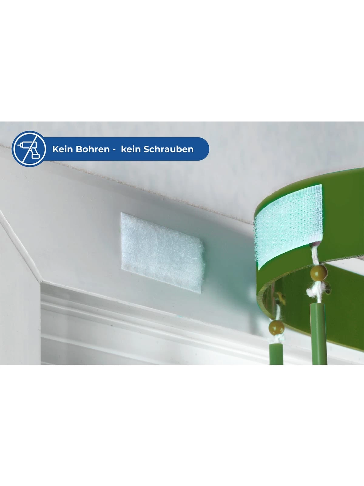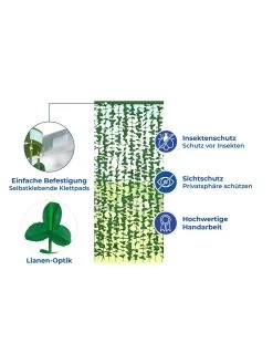 Der Türvorhang Liane lässt sich kinderleicht über der gewünschten Tür anbringen. Die selbstklebenden Klettpads sind im Lieferumfang enthalten und ermöglichen Ihnen, den Vorhang innerhalb kürzester Zeit anzubringen. Somit können Sie den Blättervorhang auch ideal für das Camping nutzen. Verschönern Sie mit dem Vorhang auch unschöne Wände und Gitter oder kaschieren Sie mit dem belebenden Grün mögliche Schönheitsfehler innerhalb der eigenen vier Wände.