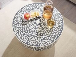Design Runder Couchtisch in modernem Design Tischplatte mit floristischem Oberflächenmuster Farblich abgesetztes Metallgestell Spannende Farbkombination aus Grau und Gold Abmessungen Breite: 60 cm Tiefe: 60 cm Höhe: 35 cm Tischplattenstärke: ca. 0,5 cm Weitere Abmessungen finden Sie im Maßbild Farbe Tischplatte: Grau-Weiß Gestell: Golden Besonderheiten Jeder Tisch wurde in liebevoller Handarbeit gefertigt und ist somit ein absolutes Unikat Viel Platz zur Ablage von Zeitschriften, Handy und Co. Aufgrund des Designs ein echter Hingucker und für viele Räume geeignet Anti-Rutsch-Noppen an den Füßen schützen Ihren Fußboden vor Kratzern Empfohlene Maximalbelastbarkeit: 30 kg Material Tischplatte: Kunstharz Metallgestell: lackiertes Eisen Lieferumfang Ein Couchtisch ohne Dekoration Montage Lieferzustand: komplett montiert und sicher verpackt Pflegehinweise Die Oberfläche mit einem lauwarm angefeuchteten Baumwolltuch reinigen. Keine Scheuermittel, scharfe Reinigungsmittel oder tropfnasse Tücher verwenden.