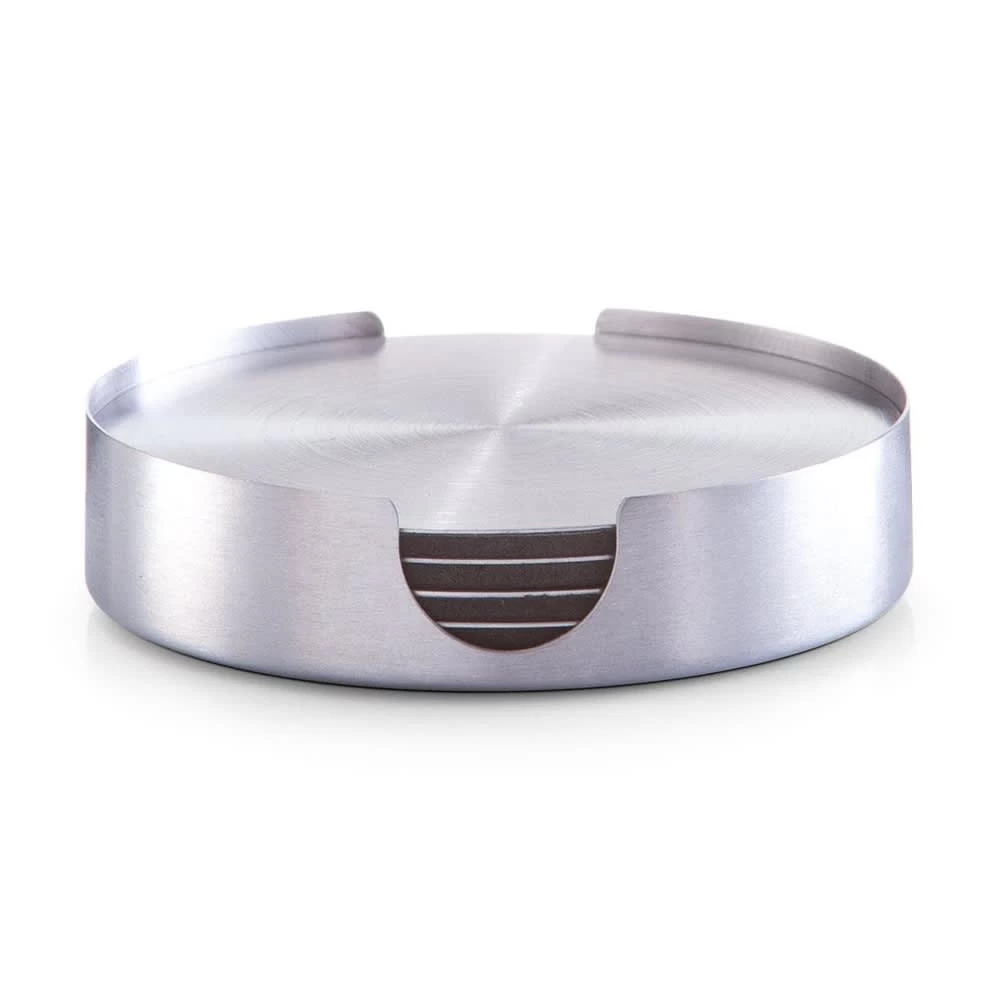 Set von sechs runden steht für Gläser, Gläser oder Becher. Es hat eine dekorative und praktische Funktion zur gleichen Zeit. Arbeitet in jeder modernen Küche, Esszimmer, Wohnzimmer oder Bar. Sorgfältig aus hochwertigem Edelstahl gefertigt. Der untere Teil ist mit einer rutschfesten Oberfläche versehen. Ein Metallregal ist im Lieferumfang enthalten.