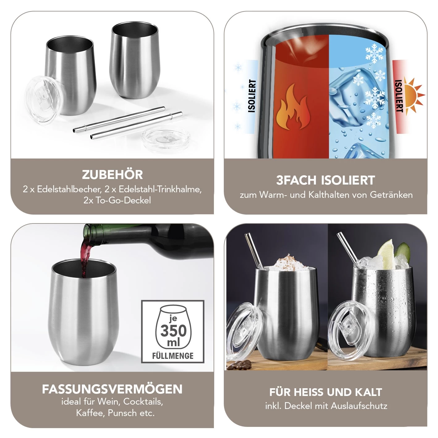 Damit Heißes heiß und Kaltes kalt bleibt: Mit den Edelstahlbechern von GOURMETmaxx können Sie Heiß- und Kaltgetränke jetzt ganz in Ruhe genießen. Denn dank der dreifachen Isolierung behält Ihr Getränk lange die richtige Temperatur. Ideal z. B. für einen lauen Sommerabend mit kühlem Wein oder einen gemütlichen Winterabend mit heißem Grog. Jeder Becher hat ein Fassungsvermögen von 350 ml und bietet so genügend Platz für jeden Geschmack – von Cocktails und Punsch bis hin zu Kaffee und heißer Schokolade.