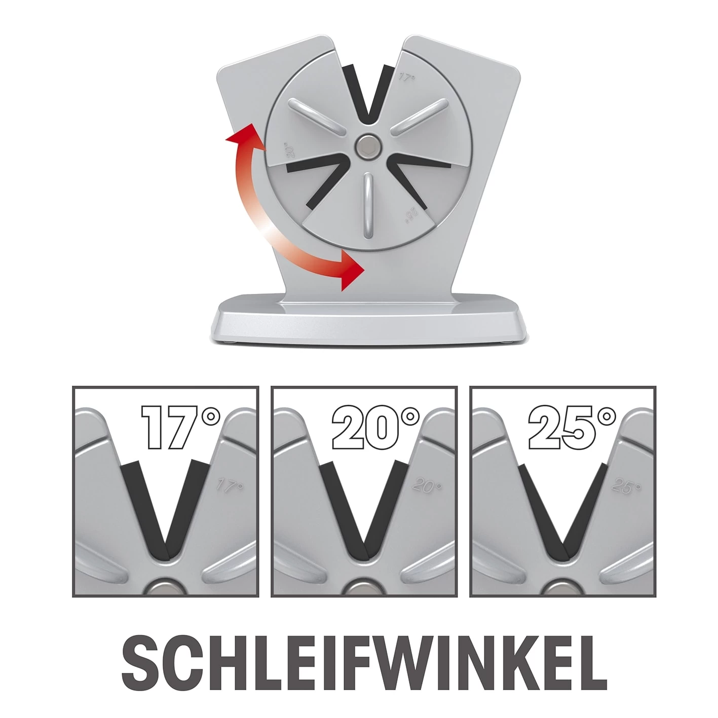Mit dem ‚GOURMETmax“ Messerschärfer bekommen Sie Ihre stumpfen Messer wieder scharf, sodass Sie Ihnen länger ehalten bleiben! Gleich drei unterschiedliche Schleifwinkel (17°/20°/25°) und die Wolframkarbid-Schleifelemente sorgen für ein optimales Ergebnis bei nahezu allen Klingenformen und Messergrößen – egal ob glatte Klingen, kleine Schälmesser oder große Fleischmesser.