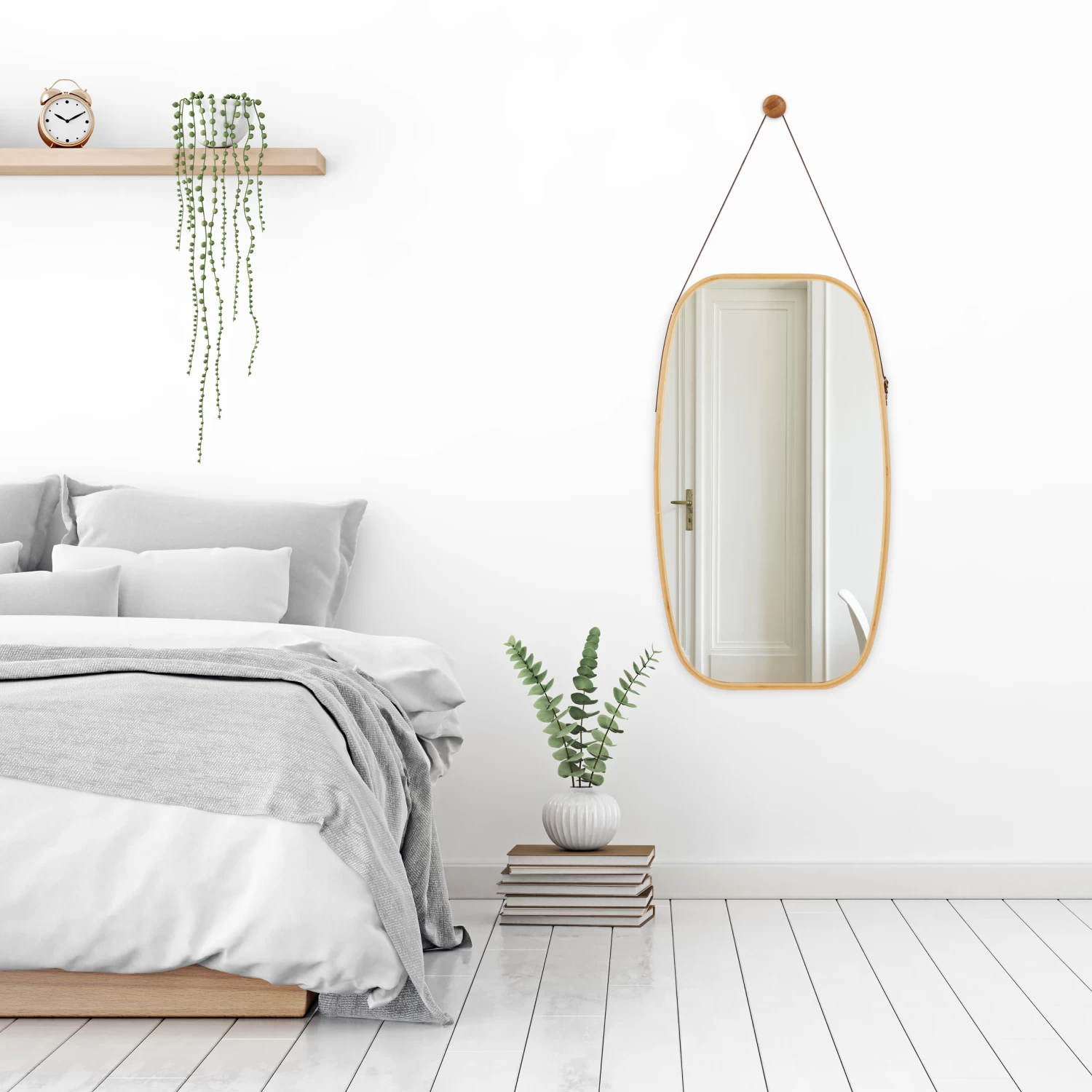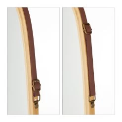 Dieser schmückende Aufhängespiegel bringt durch seinen Rahmen mit natürlicher Bambus-Maserung Wärme und Gemütlichkeit in Ihre vier Wände. Nutzen Sie den Spiegel zum Hängen als Badspiegel, Flurspiegel oder Dekorations-Spiegel im Schlafzimmer. Durch die große Spiegelfläche ist er auch als Ankleidespiegel geeignet. Der Ganzkörperspiegel verfügt über einen verstellbaren Kunstleder-Riemen, mit dem er einfach über dem an der Wand zu montierenden Holzknauf aufgehangen werden kann.