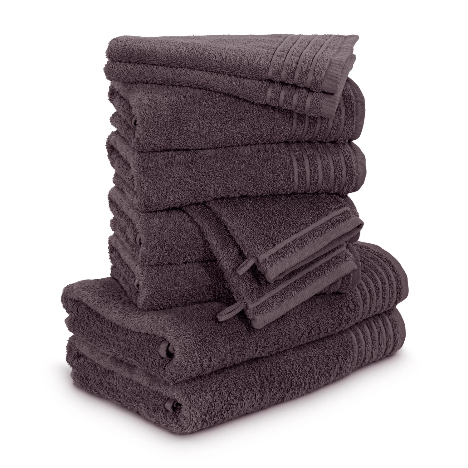 Das 10er Set – bestehend aus Waschhandschuhen, Gäste-, Hand- und Duschtüchern – der Kollektion MÖVE New Classic wird aus besonders hochwertigem Baumwollfrottier gefertigt. Durch das attraktive Gewicht von 480 g/m² sind die Tücher und Kleinteile sehr voluminös und haben einen besonders weichen und flauschigen Griff. Die Ton-in-Ton Streifen wirken als schönes Detail und tragen zur luxuriösen Optik bei. Dank des hochwertigen Kordelaufhängers lassen sich die Artikel problemlos an jedem herkömmlichen Haken befestigen. Attraktives 10er Set aus 100% bester Baumwolle (480 g/m²). Extra weich, voluminöser Griff, luxuriöse Optik und Haptik. Mit Ton-in-Ton Steifen im Saum und hochwertigem Kordelaufhänger. Inhalt: 2x Waschhandschuhe(20x15cm), 2x Gästetücher(30x50cm), 4x Handtücher(50x100cm), 2x Duschtücher(67x140cm)