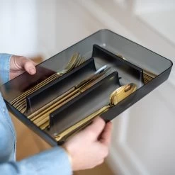 Besteckkasten RIO begeistert durch sein zeitloses Design und findet mit seiner schlanken Form sogar in schmalen Schubladen Platz. Die formvollendete Aufbewahrung für schönes Besteck. Dank seiner kompakten Maße kann RIO auch problemlos in der Spülmaschine gereinigt werden. •kompaktes Format•auch für kleine Schubladen geeignet•übersichtliche Aufbewahrung•leicht zu reinigen•100% CO2-neutral KOZIOL THERMOPLASTIC