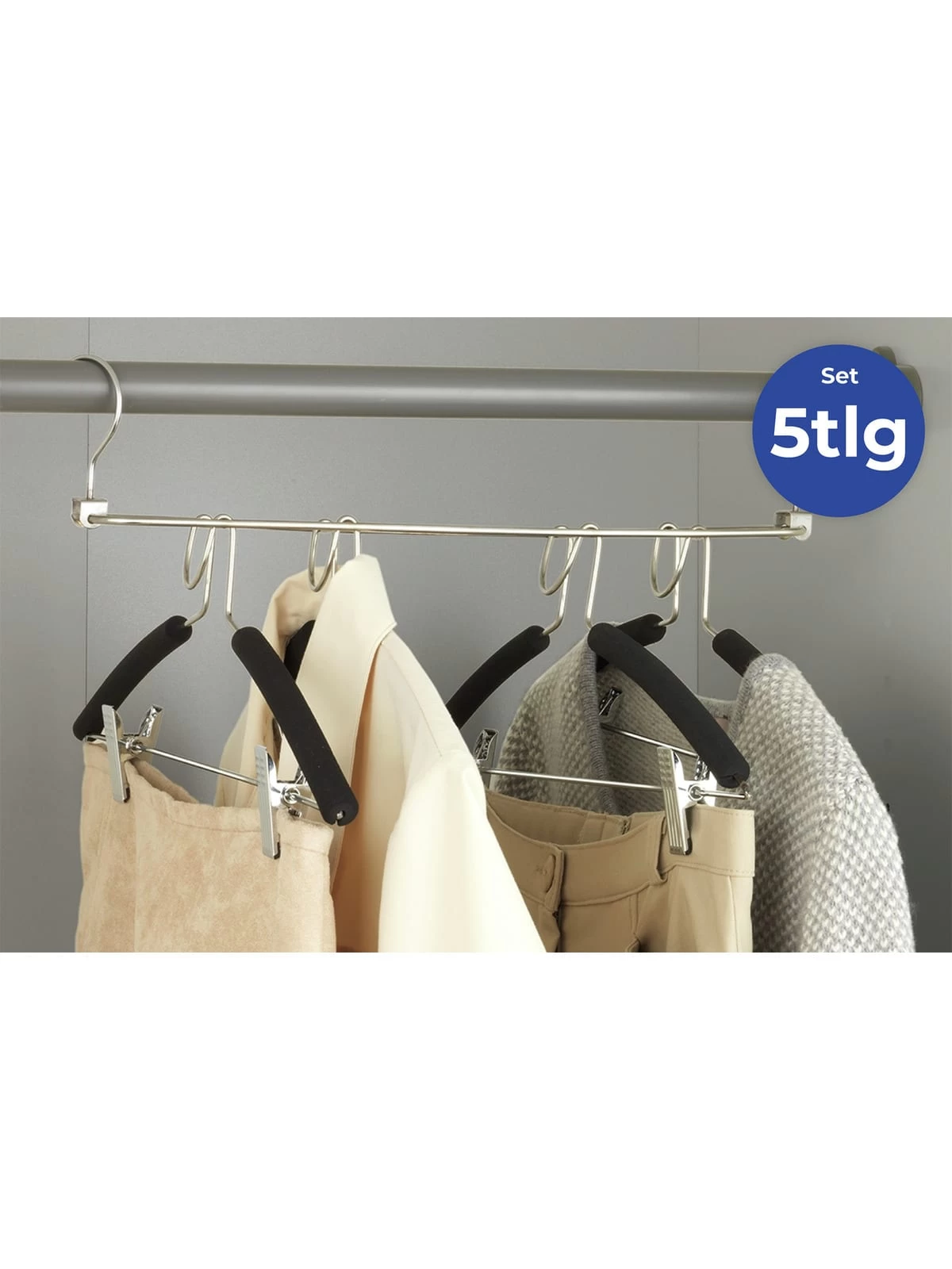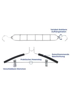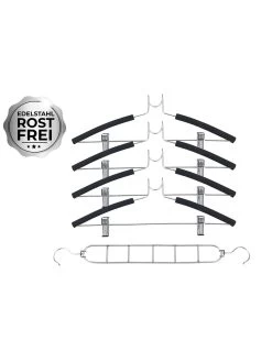 Die Kleiderbügel verfügen über einen Hosensteg sowie über einer rutschhemmenden Beschichtung, die der Kleidung den richtigen Halt verleiht. Durch die verschiebbaren Klemmen können auch Röcke und kleinere Kleidungsstücke problemlos aufgehangen werden.