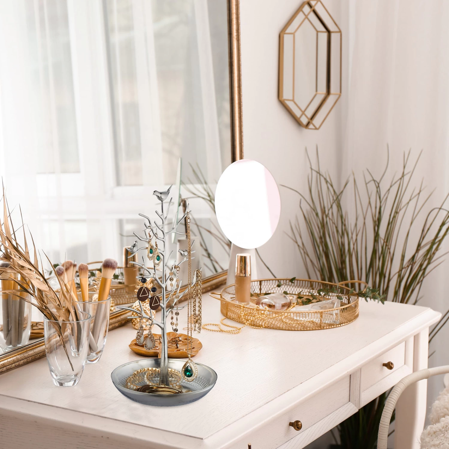 Der Schmuckbaumständer in verspielter Optik lässt Frauen- und Mädchenherzen höher schlagen. An den zahlreichen Verästelungen finden Deine Lieblingsschmuckstücke wie Ketten und Ohrringe ausreichend Platz. Uhren, Broschen oder Anhänger können auf dem praktischen Schmuckteller abgelegt werden. Das edle Baum-Design macht den Kettenhalter auch ohne viel Schmuck zum dekorativen Accessoire im Bad oder Schlafzimmer. Nie wieder suchen: Mit dem Schmuckständer hast Du Deine Kostbarkeiten stets im Blick.