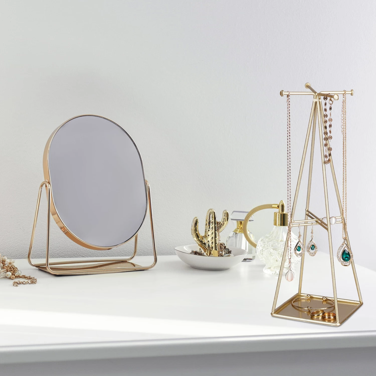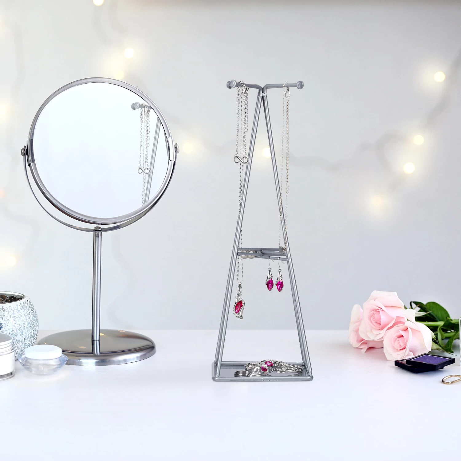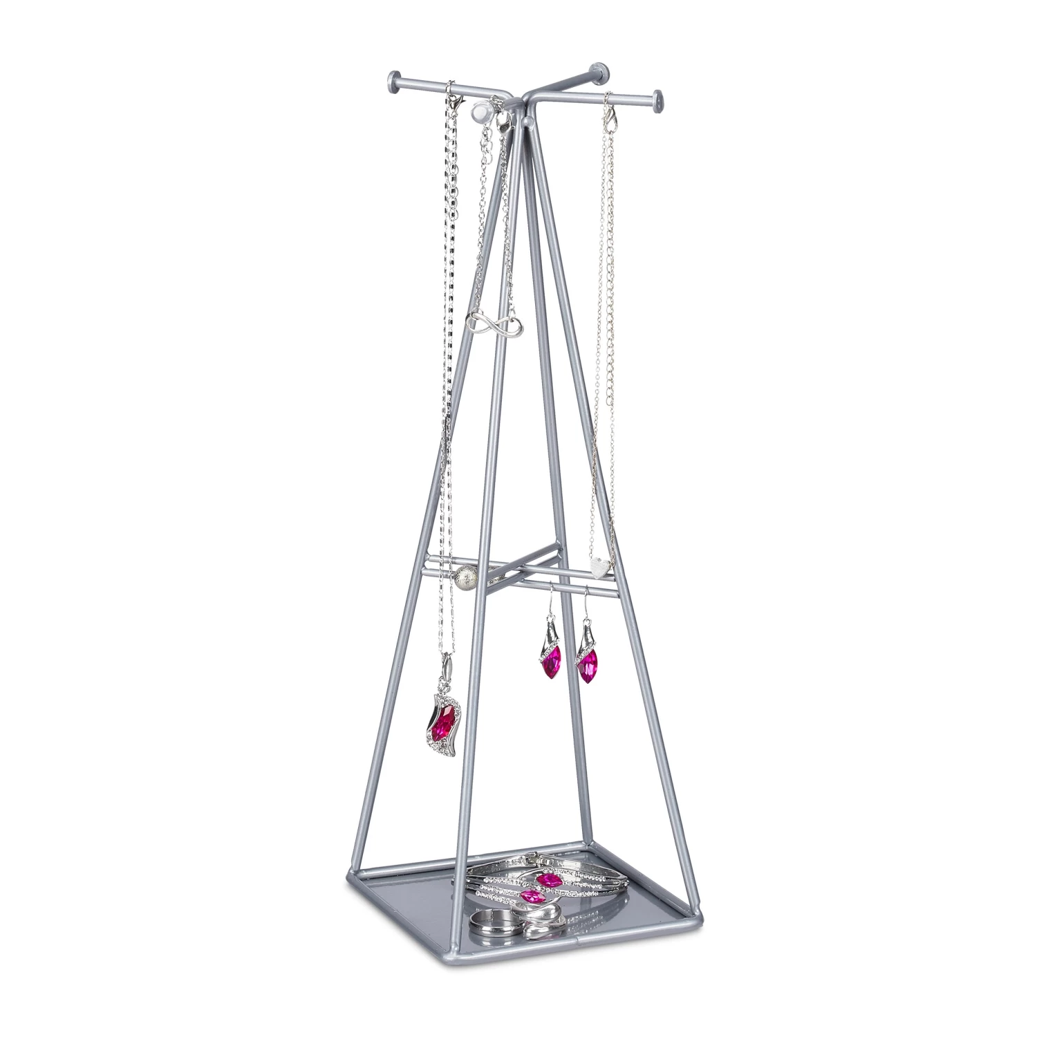 Die elegante Kettenaufbewahrung im originellen Pyramiden-Design sorgt für Ordnung und Übersicht auf dem Frisiertisch. Vier Kettenstangen bieten ausreichend Platz für kurze sowie lange Halsketten. An den Querstreben können Ohrringe und -stecker aufgehängt werden. Der Boden ist zugleich Ablage für Ringe, Broschen und andere Schmuckstücke oder Accessoires. Dank der schlichten, zeitlosen Optik fügt sich der Ketten-Organizer hervorragend auf jedem Schminktisch ein.