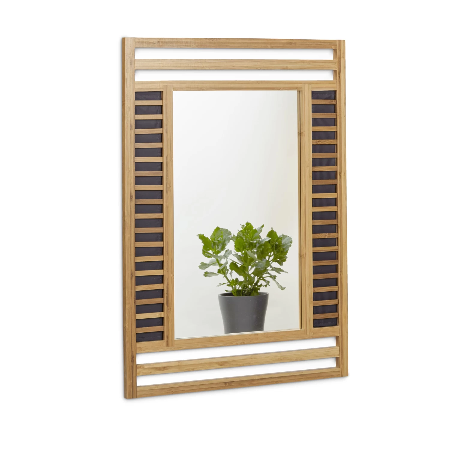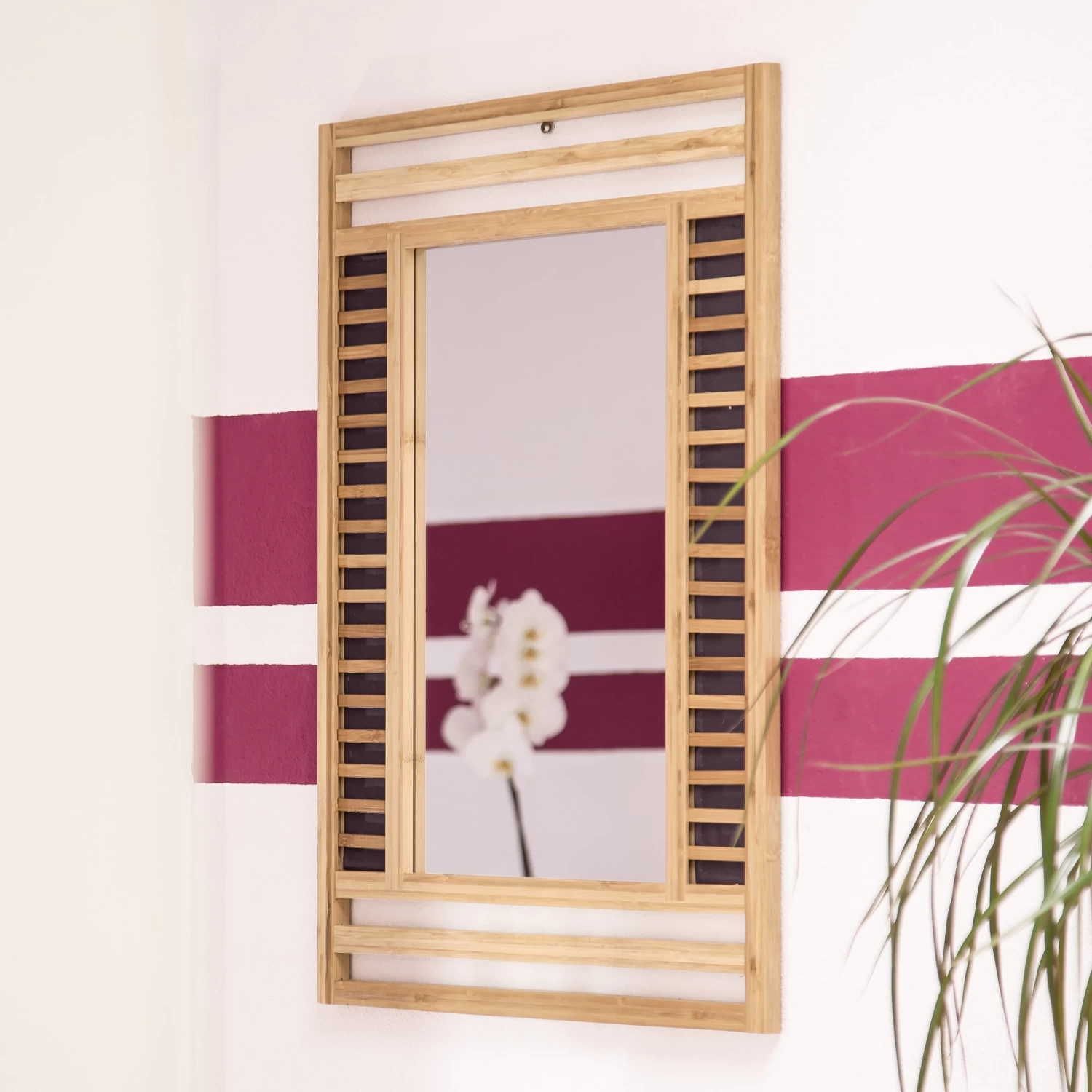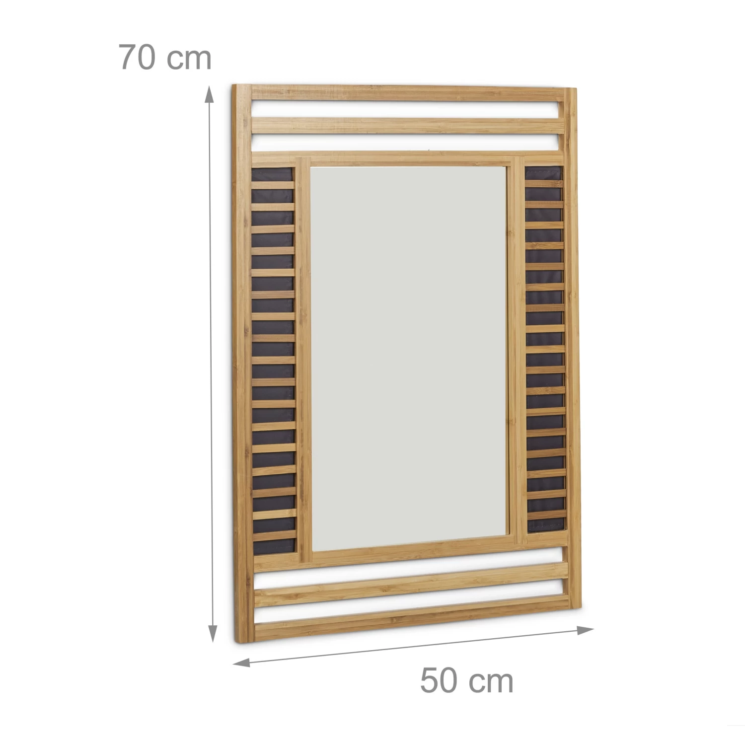 Bringen Sie natürliche Wohnlichkeit in Ihr Zuhause mit dem dekorativen Bambus Spiegel. Ein eckiger Rahmen im Hochformat umfasst das Spiegelglas. Der Rand aus dem exotischem Bambusholz wirkt dank Lamellen-Optik luftig und leicht. An den Seiten ist der Rahmen mit schwarzem Stoff bezogen und bildet einen ansprechenden Kontrast zur Spiegelfläche. Die Wandmontage ist mittels integrierter Aufhängevorrichtungen schnell erledigt.
