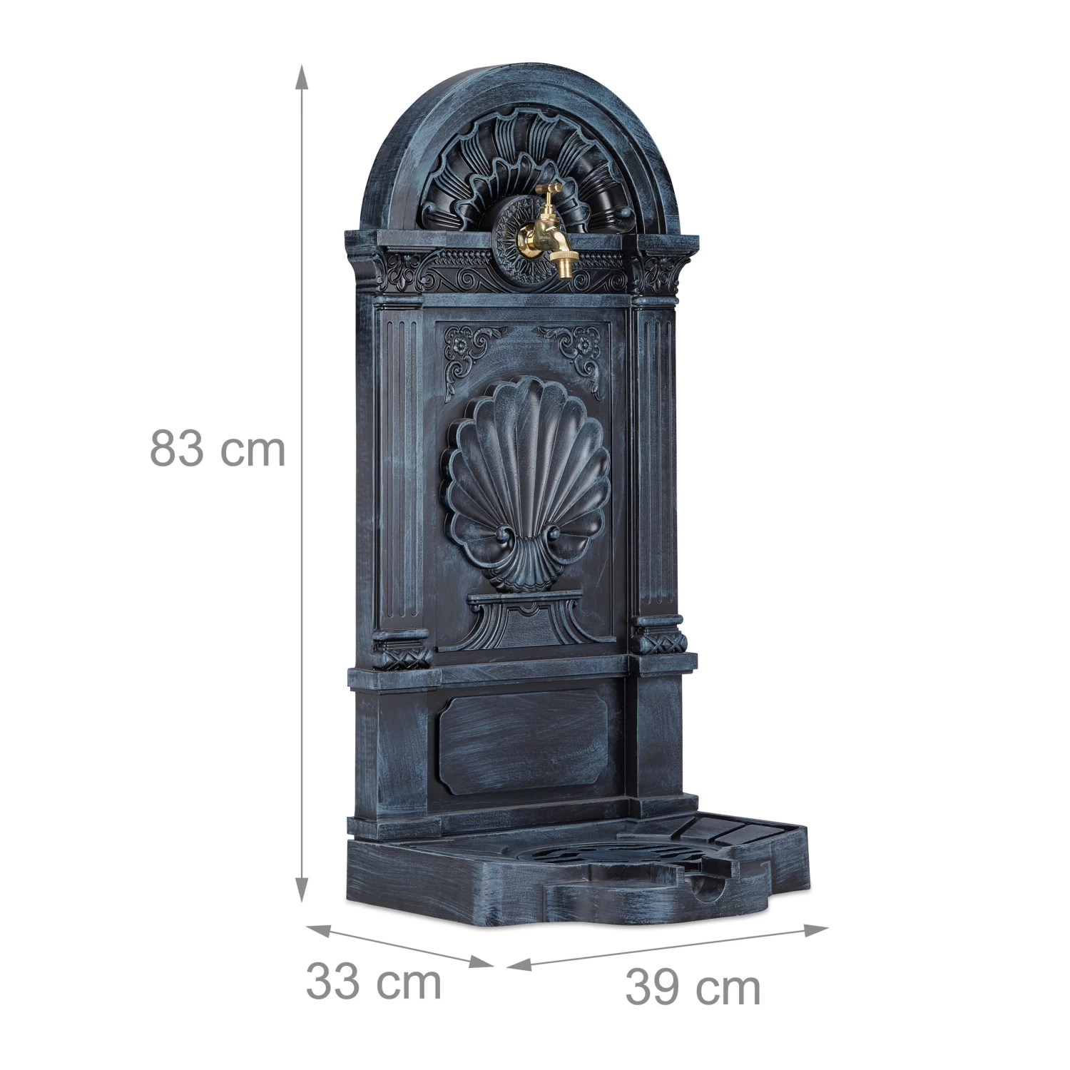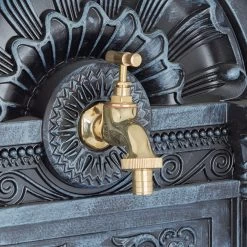 Der Gartenbrunnen ist mit einem praktischen kleinen Wasserhahn und einem runden Becken ausgestattet. Das Gitter ist ideal zum Abstellen von Gießkannen, Blumentöpfen oder anderen Gegenständen. Der aufwendig gestaltete Zierbrunnen kann freistehend oder an der Wand platziert werden.