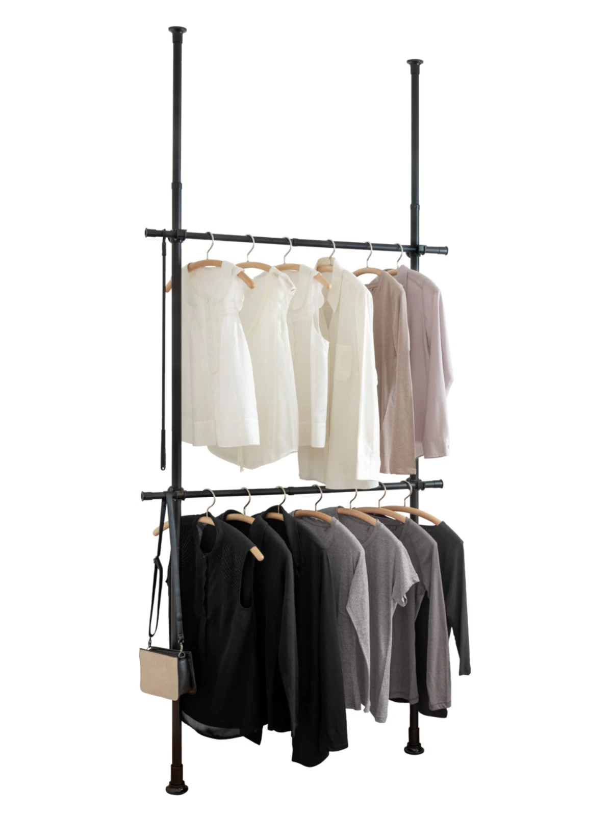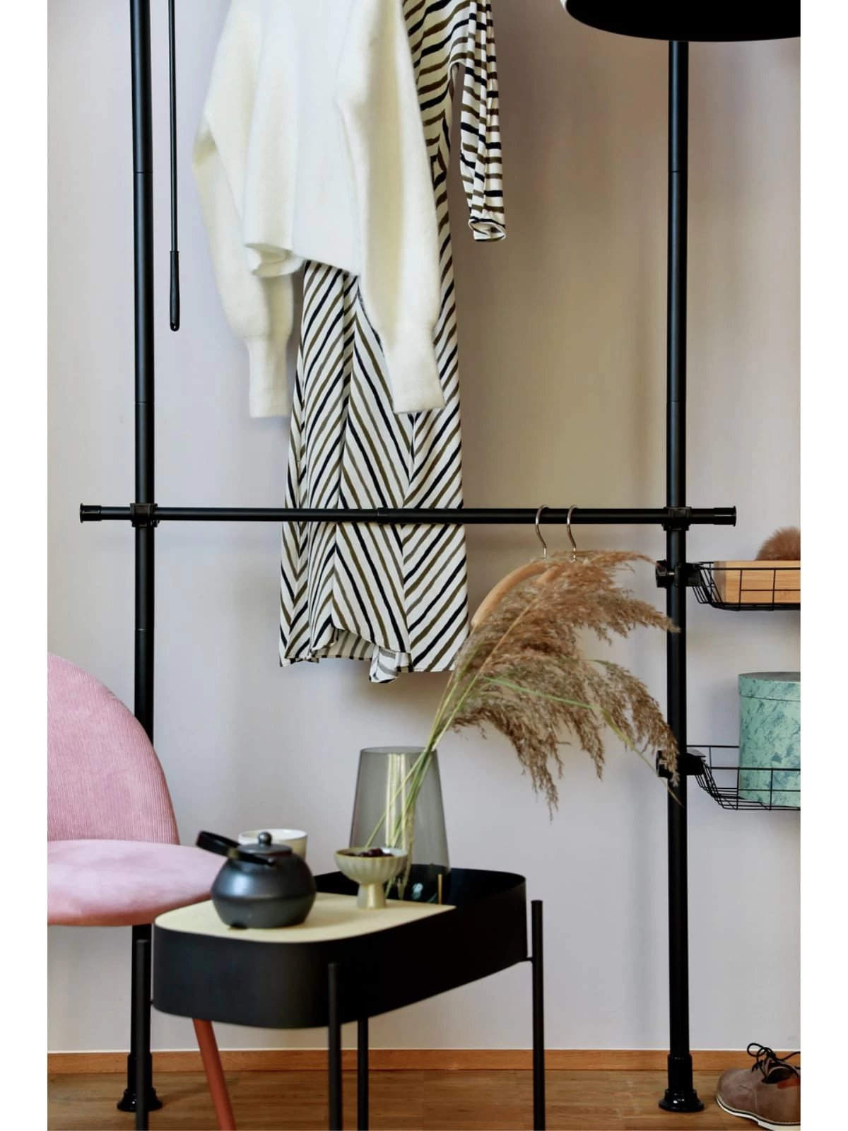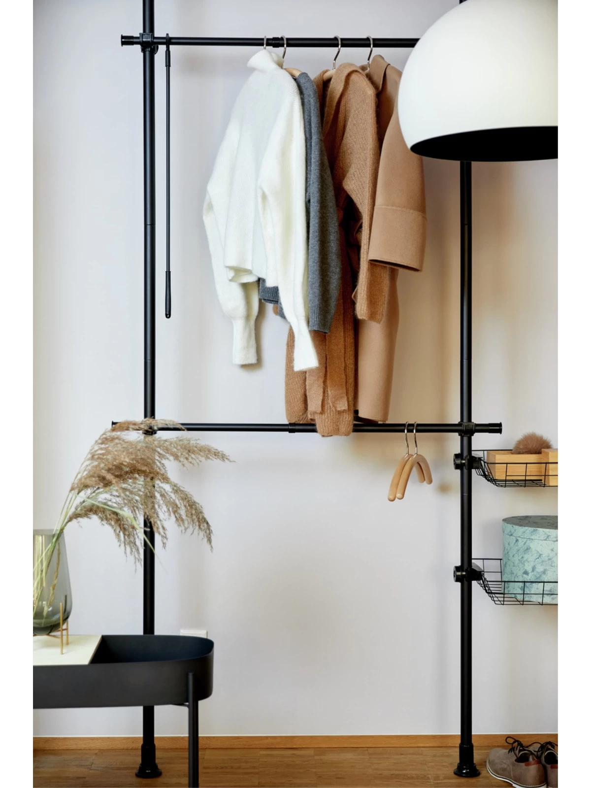 Die Trägerstangen lassen sich in der Höhe von 165-300 cm teleskopisch ausziehen. In der Breite ist das System von 75-120 cm an den Raum anpassbar. Mit dem mitgelieferten Kleiderhaken können auch höher hängende Kleidungsstücke einfach und schnell erreicht werden.