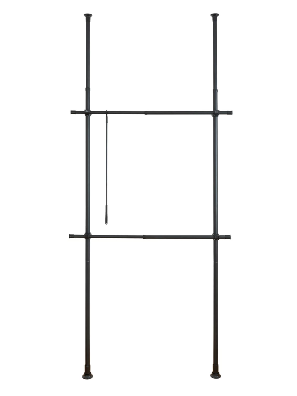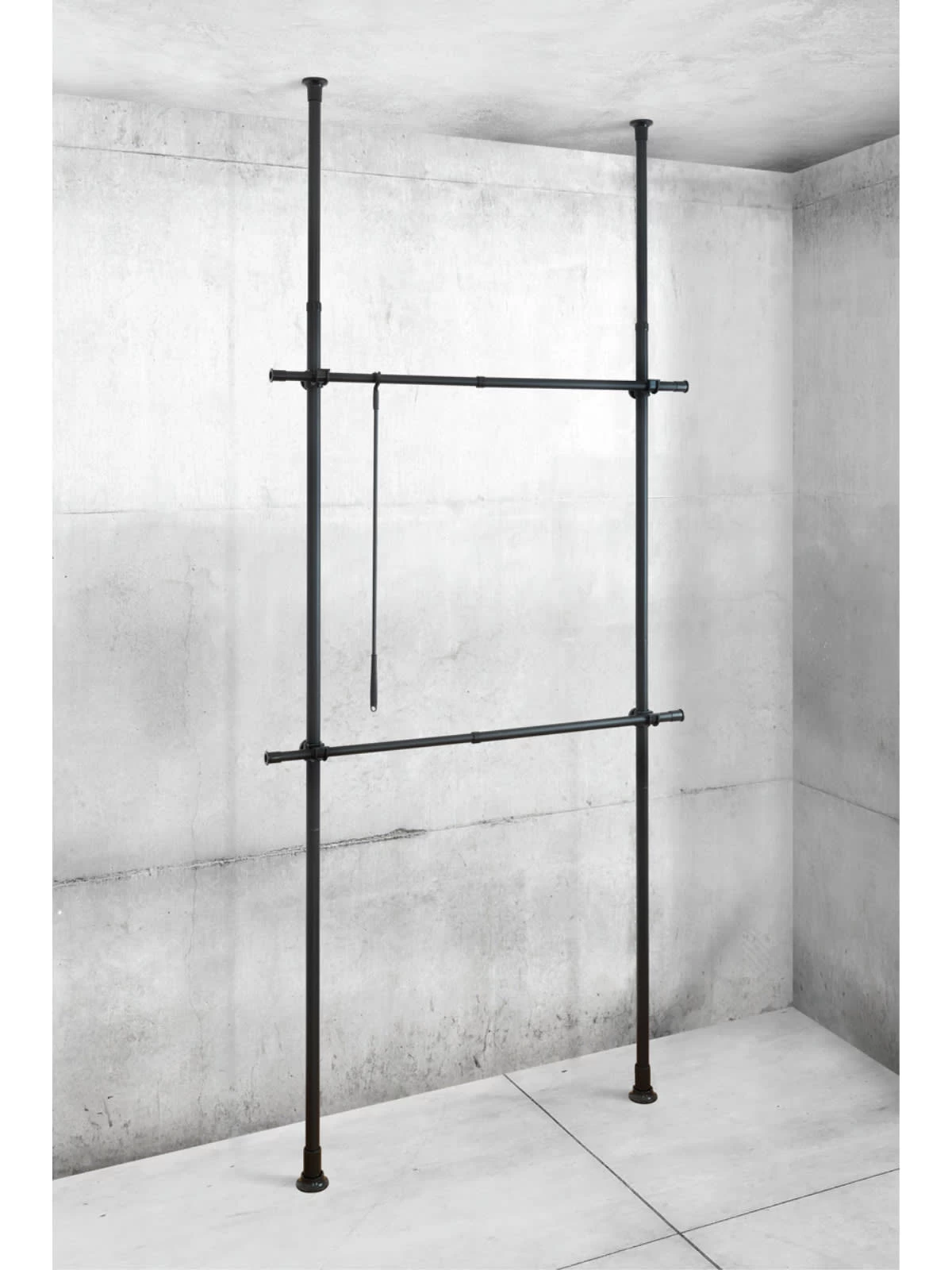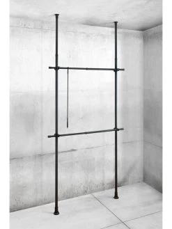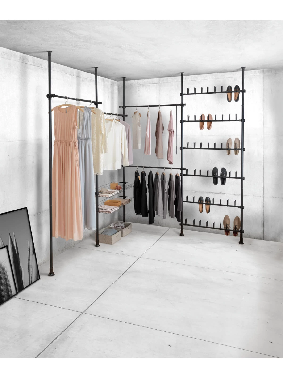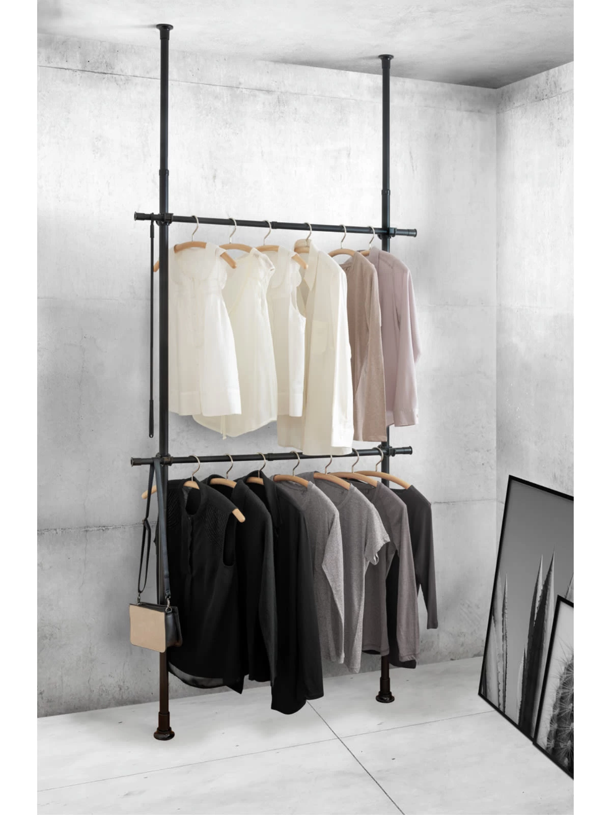 Das Teleskop-Garderoben-System aus besonders schwere Qualität ist aus schwarzen, pulverbeschichteten Metallstangen kombiniert mit hochwertigen, schwarzen Kunststoff-Verbindungsstücken gefertigt. Der Auf- und Einbau erweist sich ebenfalls als kinderleicht. Ganz ohne Werkzeug und Bohren kann das Kleidungssystem zwischen Decke und Boden eingeklemmt werden.