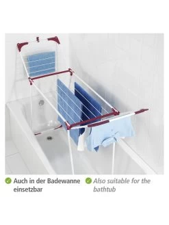 Der multifunktionale Wäschetrockner Summer Dry erweist sich als echtes Highlight unter den Wäschetrocknern. Er überzeugt nicht nur durch seine moderne Erscheinung in Weiß und Bordeaux, sondern ist zudem noch äußerst praktisch. Ob drinnen oder draußen, er ist stets einsatzbereit und erfüllt seinen Zweck hervorragend. Durch seine praktische Form ist er leicht zu handhaben und zu verstauen und eignet sich bestens für den Gebrauch in der Badewanne.